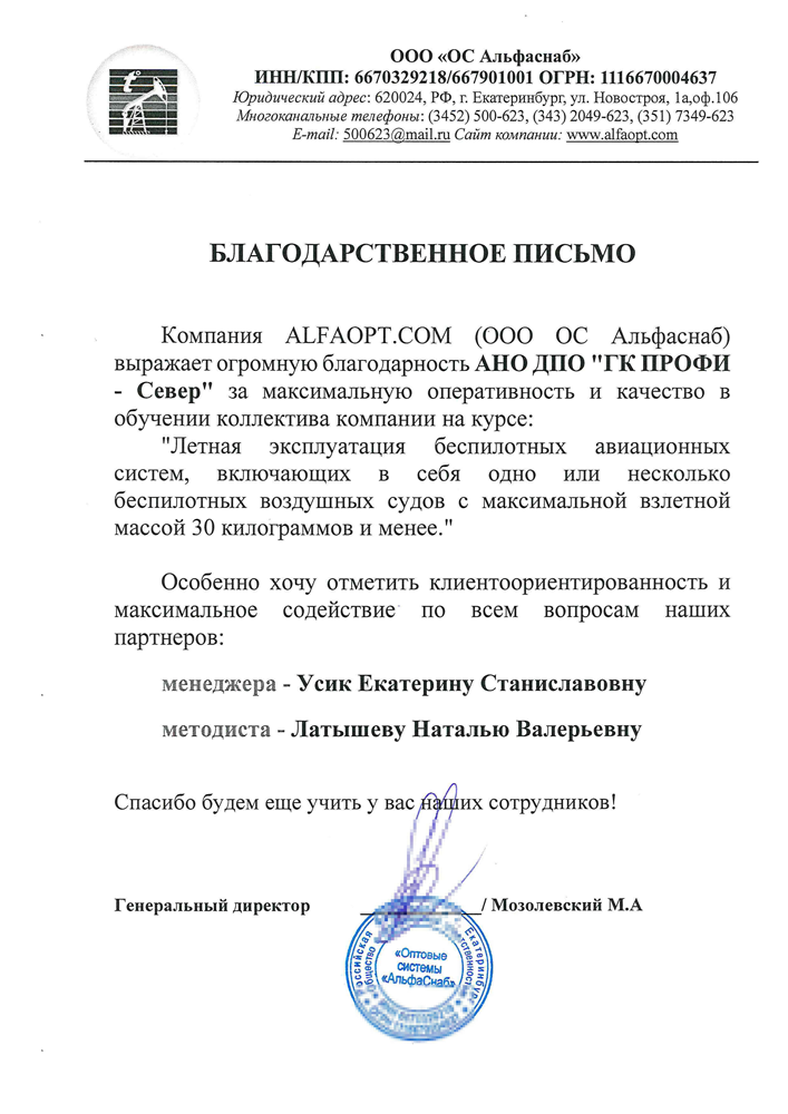— ООО «Летай и Смотри Агро» по программе: Специалист по эксплуатации беспилотных авиационных систем, включающих в себя одно или несколько беспилотных воздушных судов.